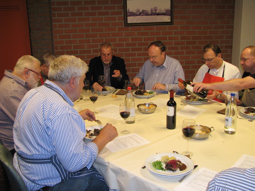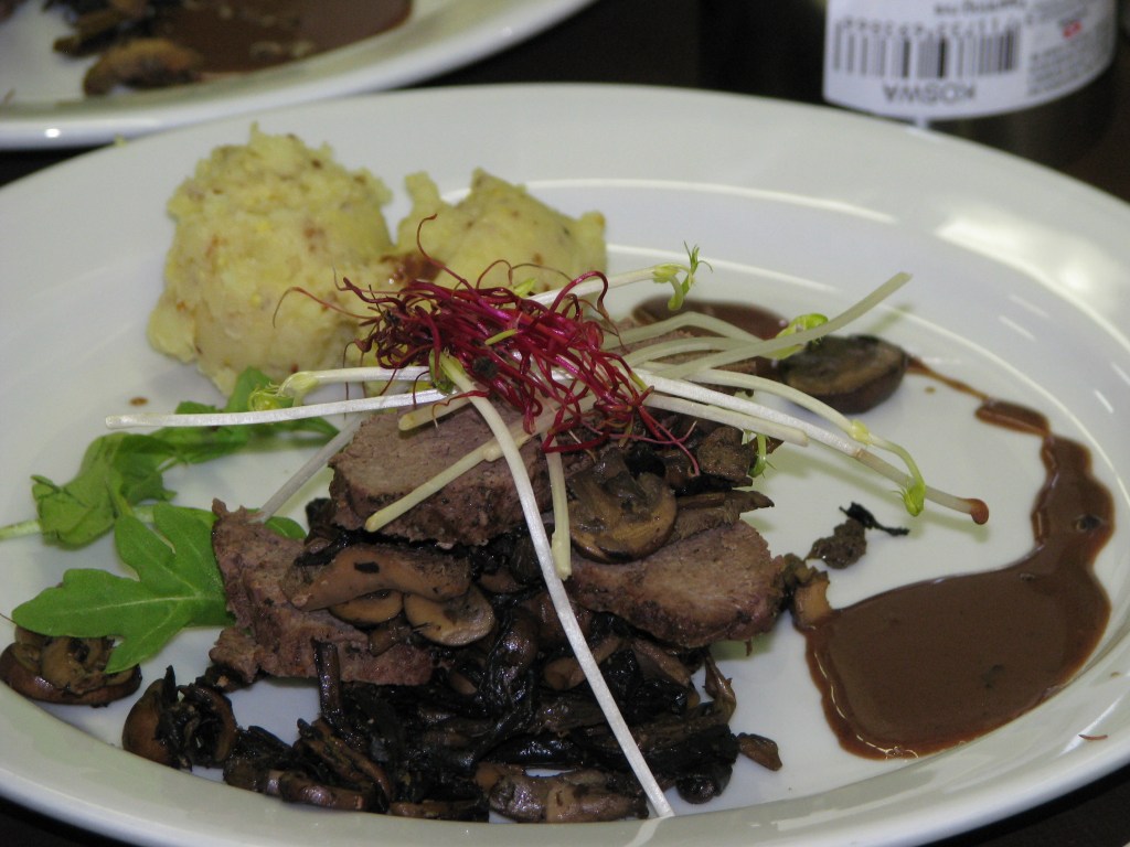 1/3 l wildfond, 600 g hertenkalffilet, salie en tijm, 1 sjalot, 1 knoflookteentje, rozemarijn, 300 g wilde paddenstoelenmengeling, perensiroop (poepgelei), donkere chocolade, raketsla + scheuten voor afwerking, aardappelen (nicola), zaadjesmosterd, room, melkerijboter
