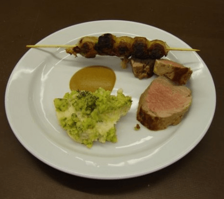 6 varkenshaasjes, 2 gelijke delen aardappelpuree, erwtjes, 1 kg spruitjes, 24 sneden dun gerookt spek, 4 flesjes klassieke geuze, jeneverbessen, laurier, tijm, mosterd (12 tal soeplepels), 2 dl room