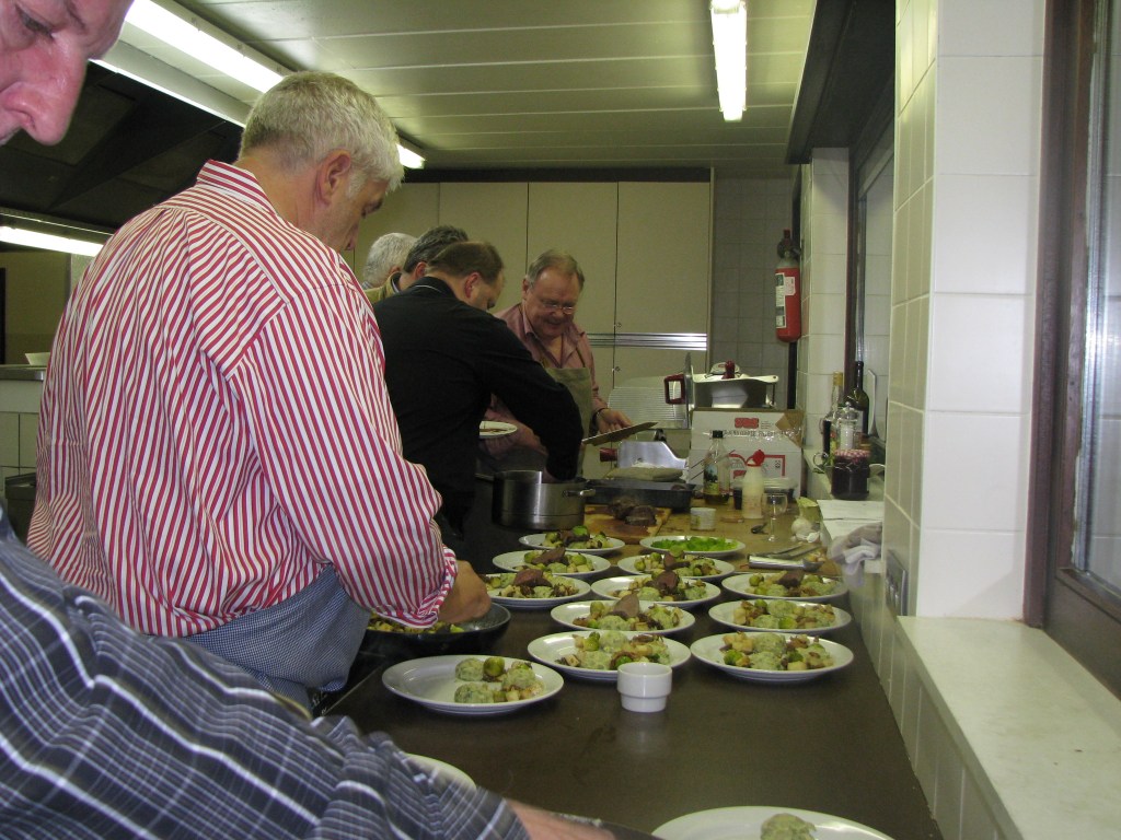 - knolselder schoon maken en in ruitjes snijden, spruitjes schoon maken en kort koken in licht gezouten water, champignons schoon maken en bakken in wat boter met de gehakte knoflook en kruiden met peper en zout, en de knolselder en spruitjes toevoegen