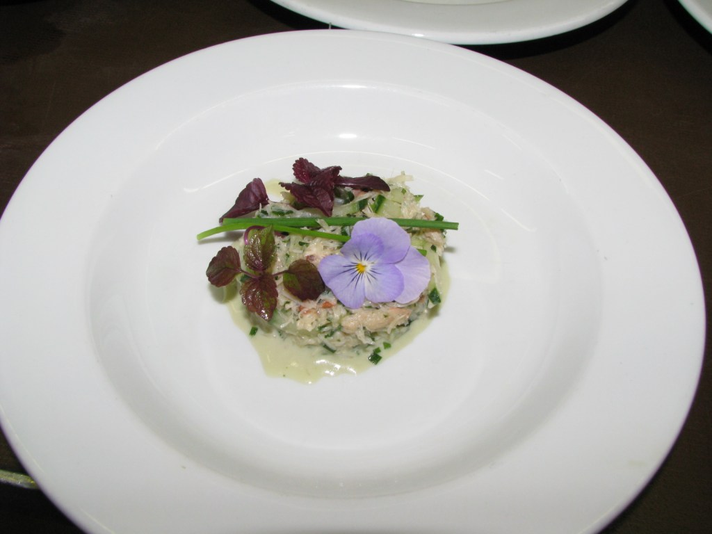 Krabmengsel : 2 el mayonaise, 2 ansjovisfilets, 200 g krabvlees, 2 el komkommer in julienne, bieslook, truffelolie, basilicum, 1 limoen, purperen shiso, blauwe eetbare bloempjes (indien mogelijk)
