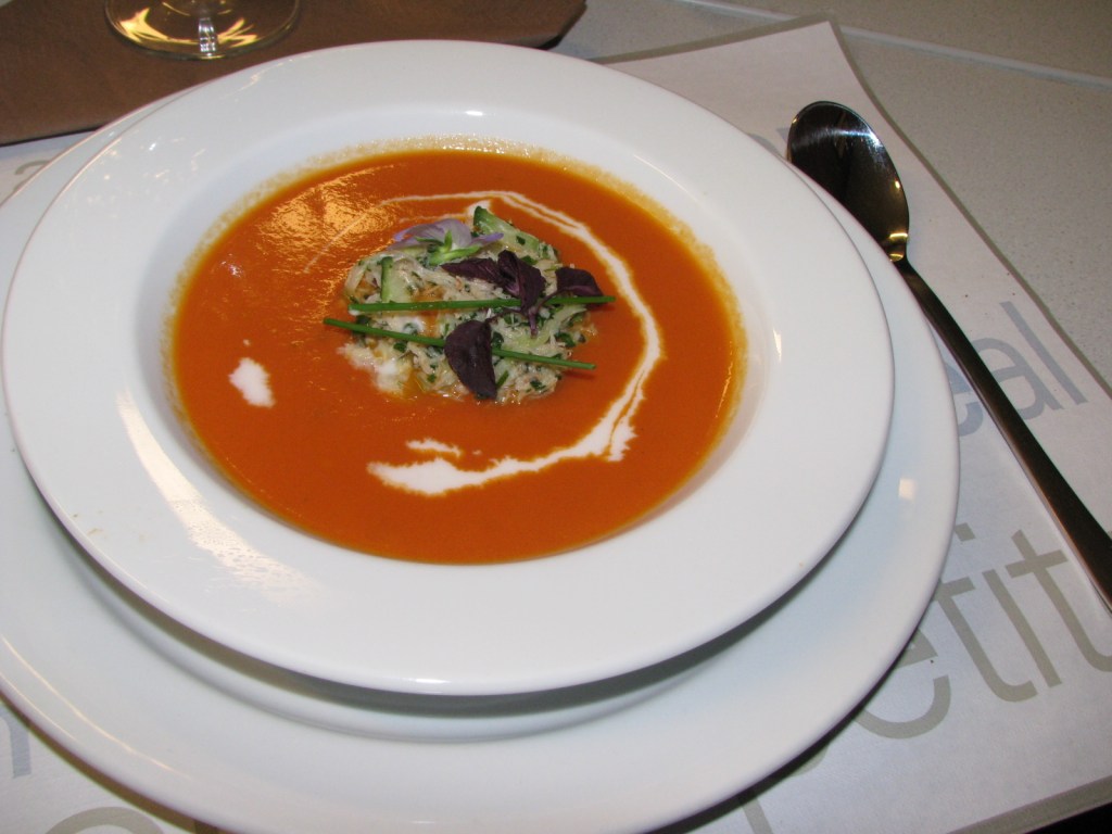 - Krabmengsel in midden van bord en soep er omheen, Garneer met shiso en wat druppels kokos.