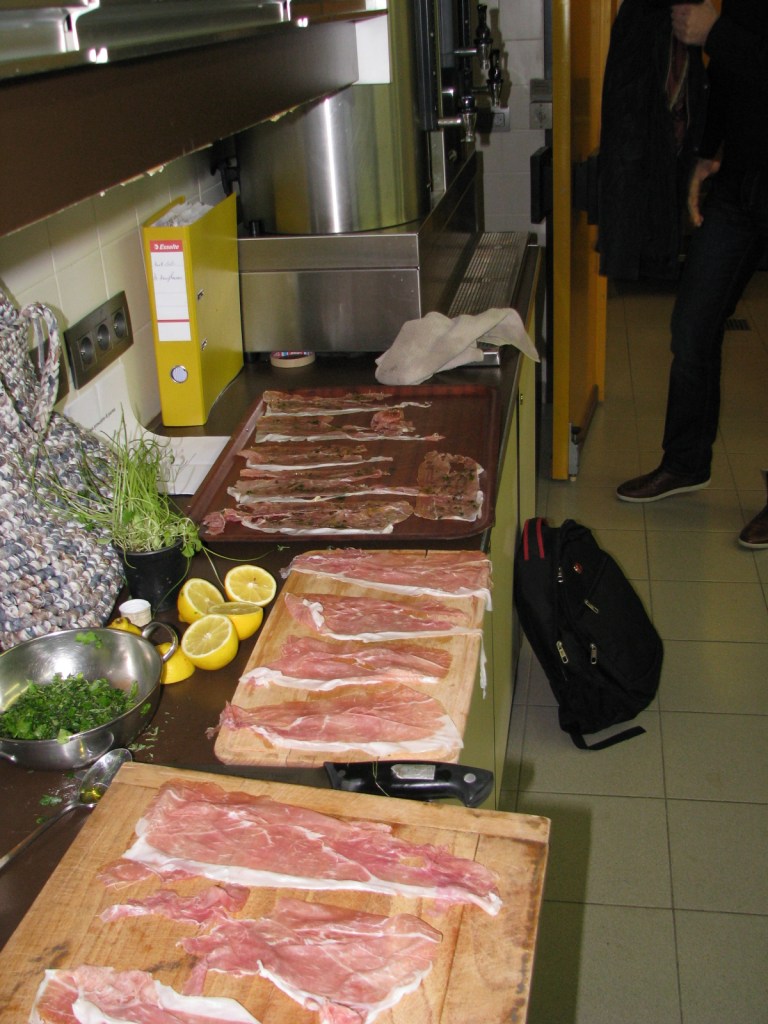 28 grote coquilles, 1 bosje bladpeterselie, 15 takjes verse tijm, 24 plakken parmaham, sap van 3 citroenen, rucola (1 zakje voor garnering),