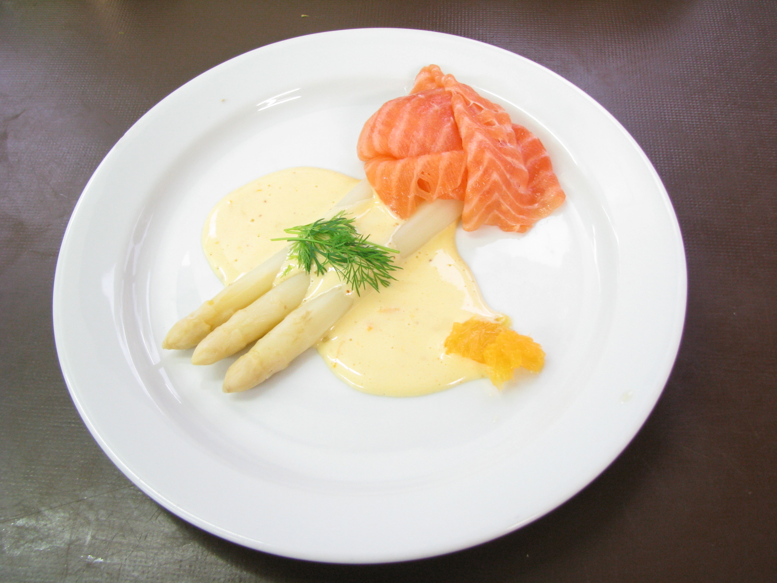 Op een lauw-warm bord de asperges schikken met de gerookte zalm en de saus. Garnieren met appelsienpartjes en gehakte peterselie.