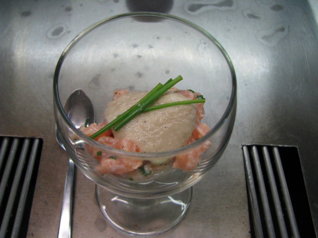 - Verdeel de zalmtartaar over lepels of schaaltjes en schep er wat lycheecompote bij.