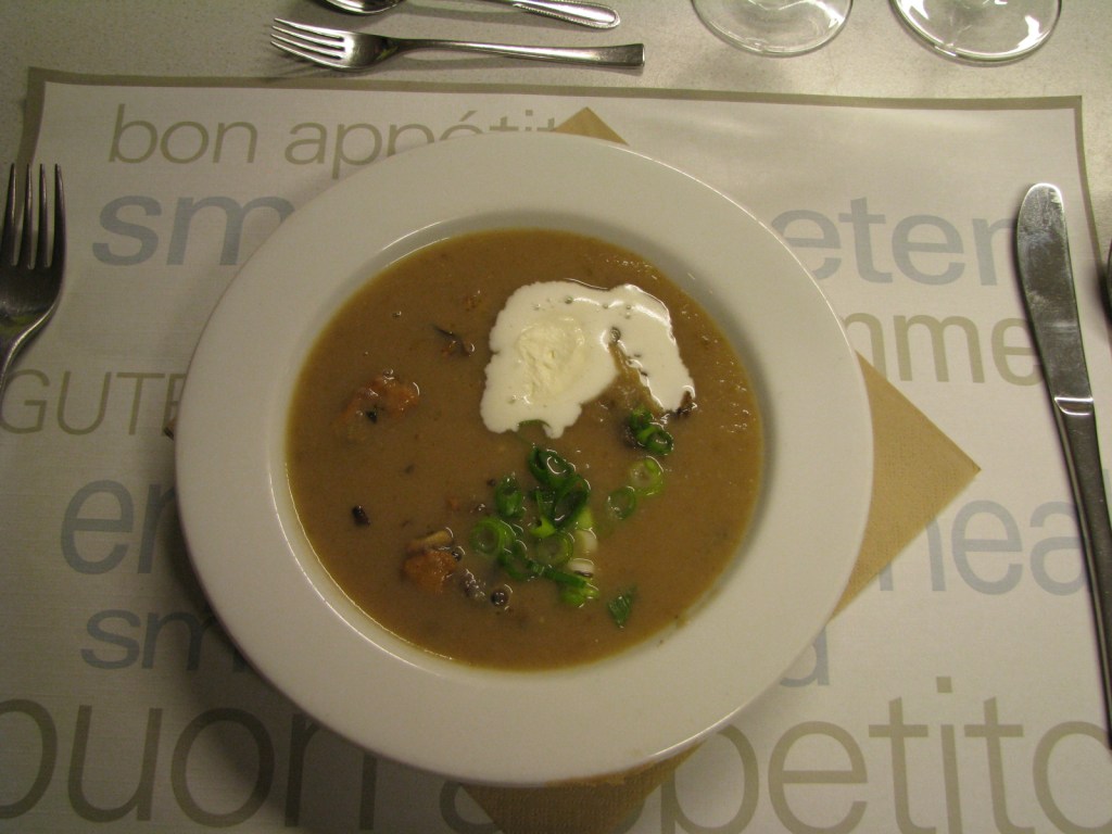 - Mix de soep nogmaals luchtig door en verdeel ze over de borden, schik er de gehakte kastanjes en de gebakken paddenstoelen in en werk af met wat zure room en de lente-ui.