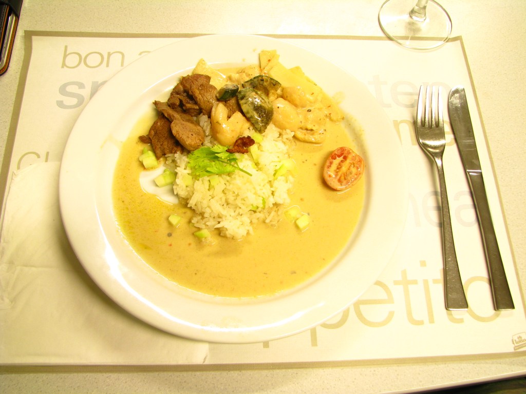 - Vlak voor het doorgeven, het vlees bij de curry voegen.