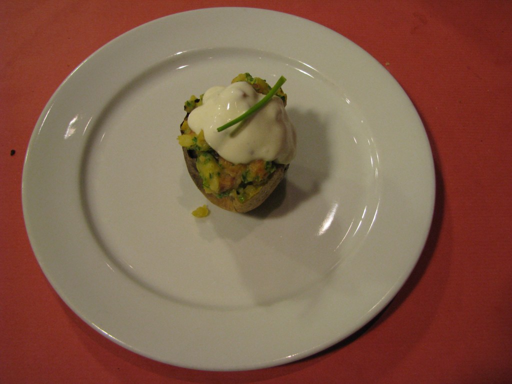 Gevulde gepofte aardappel met garnaaltjes en zure room