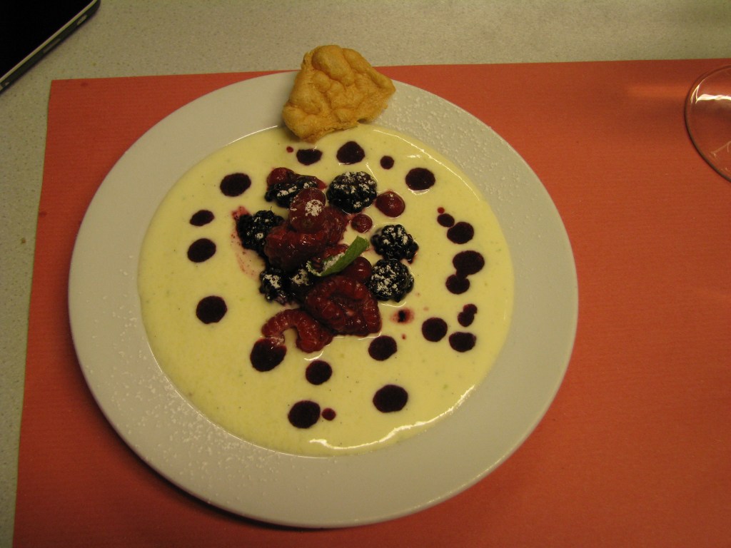 - Spuit er enkele mooie punten crème van yoghurt bij, werk af met blaadjes munt, verbrokkelde meringue en serveer er de coulis apart bij.