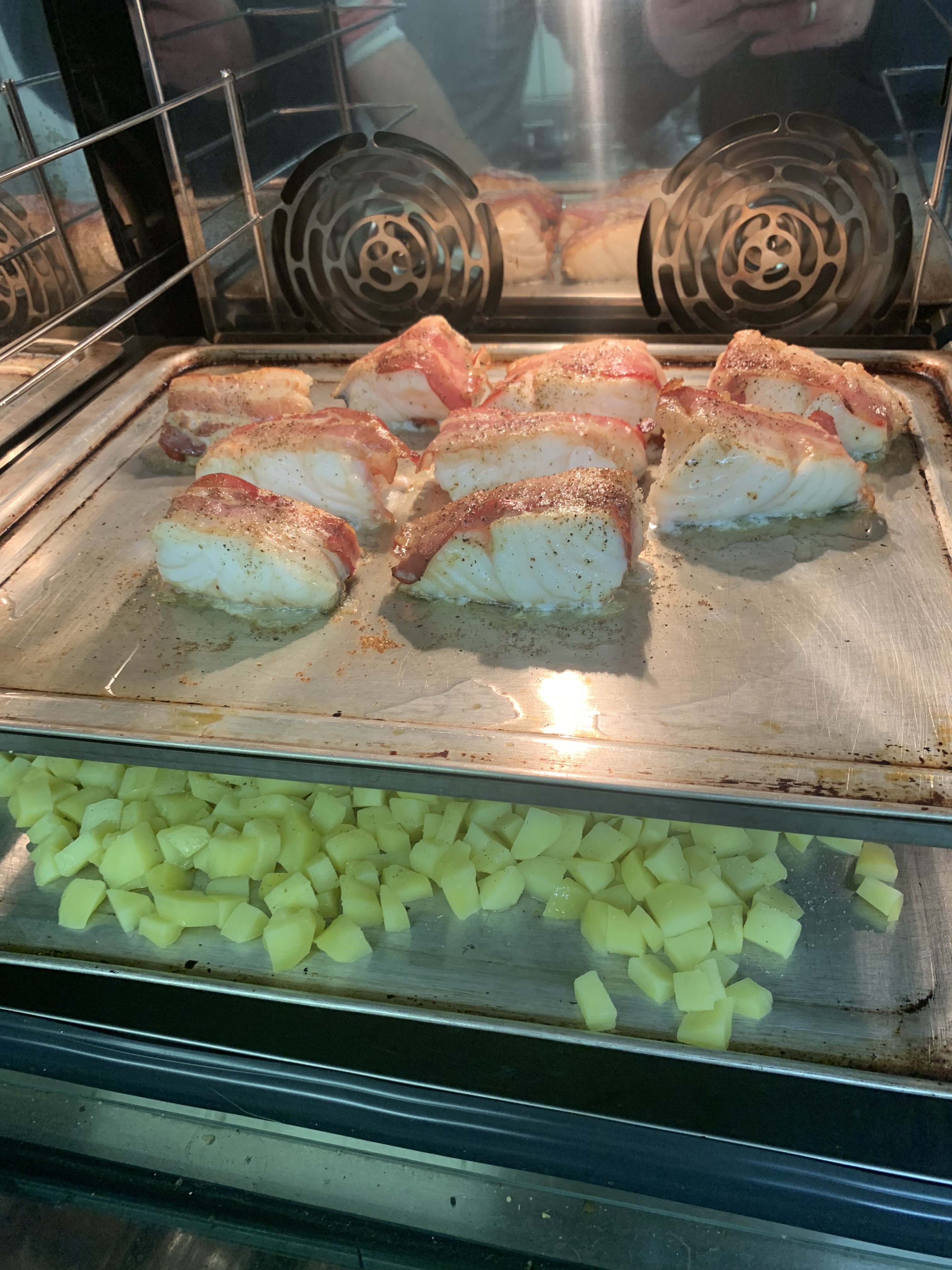 - Vis in porties snijden en omwikkelen met spek.