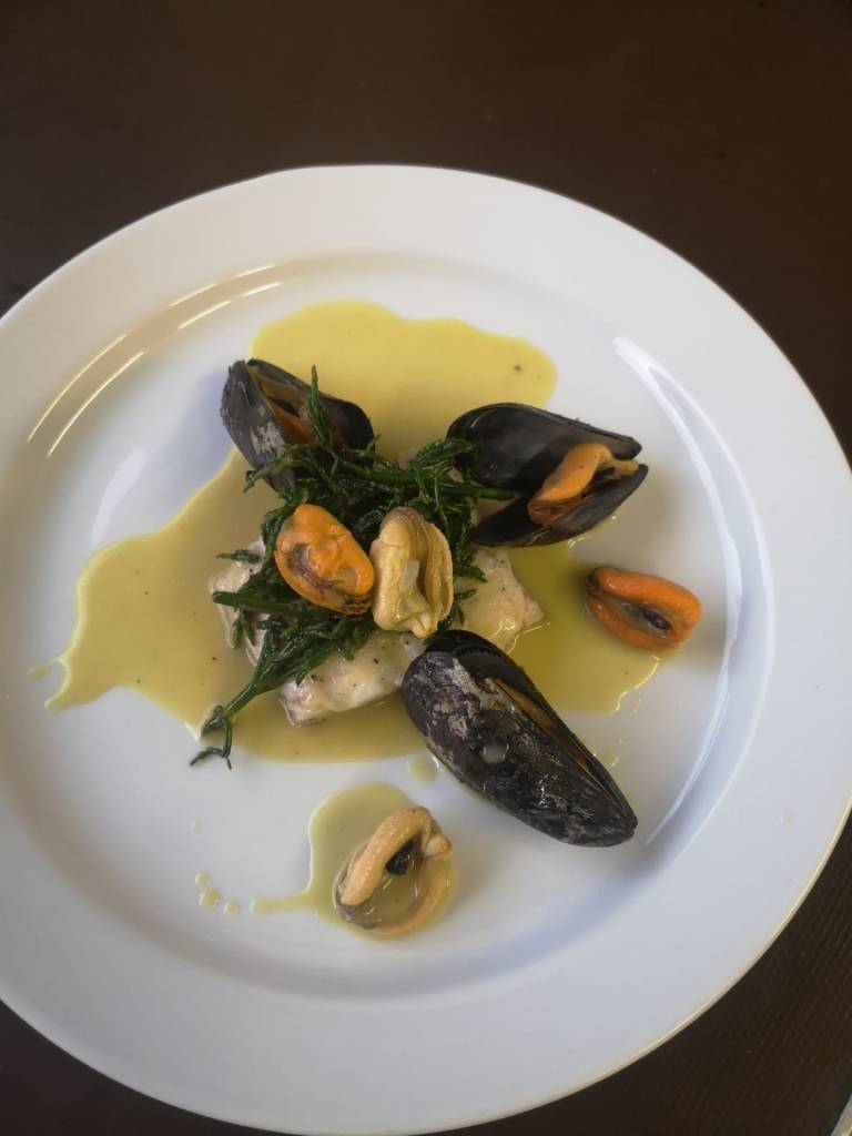 - Vis in porties snijden en kruiden met peper en zout. ven aanbakken in boter en verder garen in oven voor 8 min op 160°.