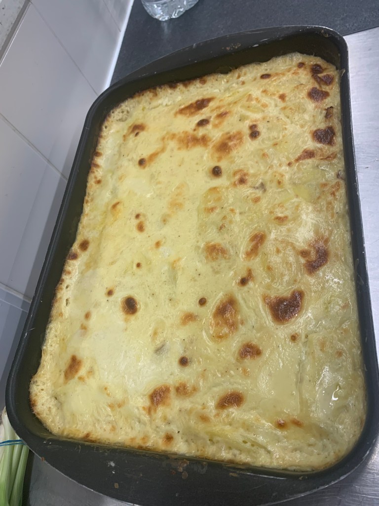 - De aardappelen dakpansgewijs in schotel schikken en overgieten met saus.