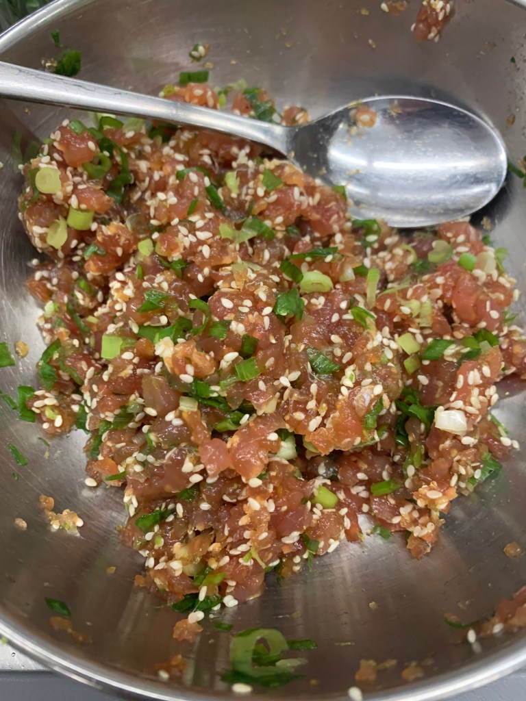 - De tonijn mengen met 2el sojasaus, sesamzaadjes en zeste van limoen.
