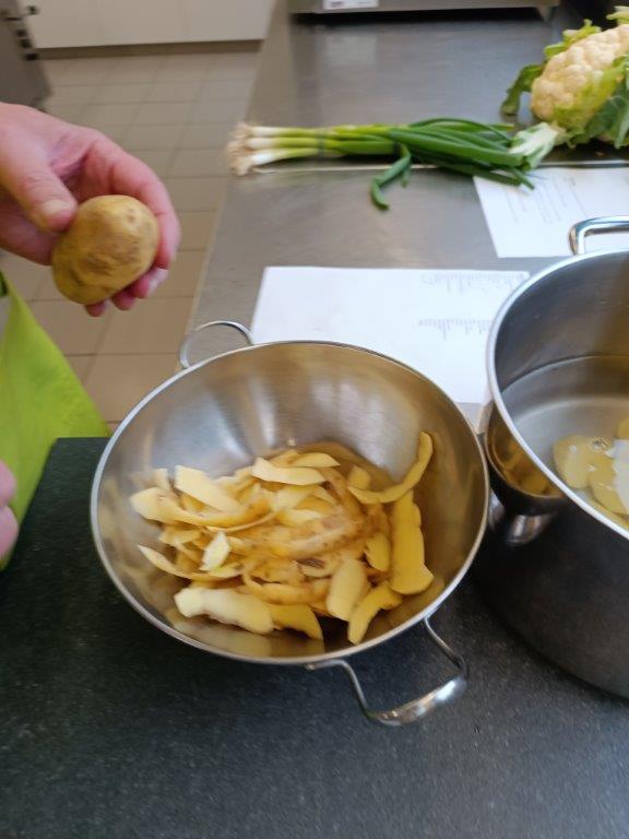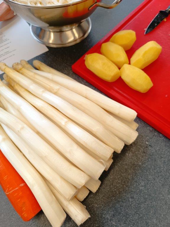 - Nadien de schillen van de asperges toevoegen. Even meestoven.