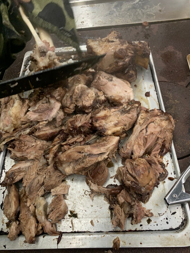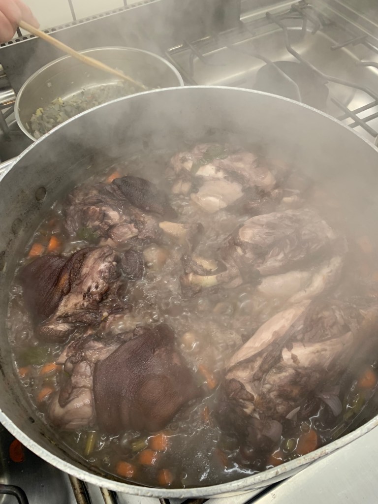 - De schenkels 2 uur laten garen. Om de 30 min het vlees draaien.