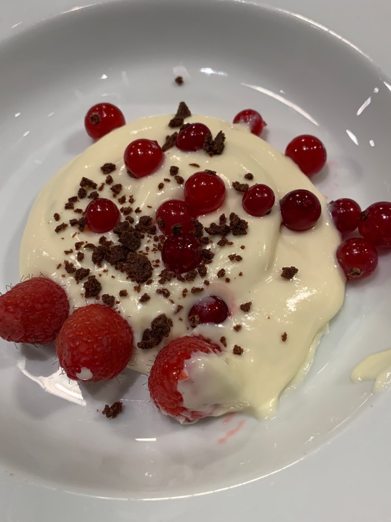 - In een spuitzak doen en op een bord spuiten. Afwerken met rood fruit en chocoladezand