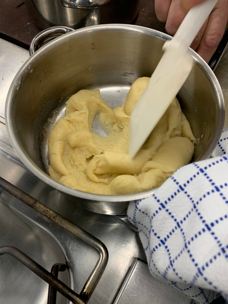 - Als na het toevoegen van de eerste 4 eieren het mengsel nog stijf is, voeg dan de telkens 1 ei toe tot het deeg voldoende elastisch is.