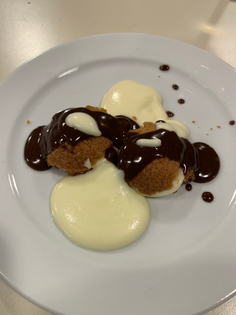 - Doe een lepel saus op het bord en leg hierop de profiteroles.
