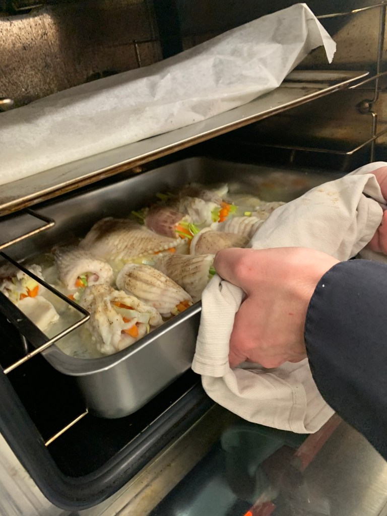 - Bevochtig de filets met visfond en vocht van tapijtschelpen en zet in oven op 140°c voor 5 min.