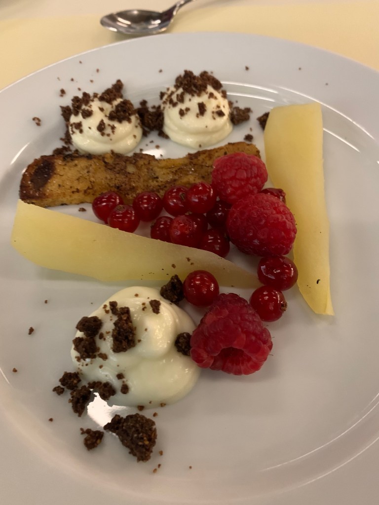 - Werk bord af met brood, mousse, platte kaas, rode vruchten en munt.