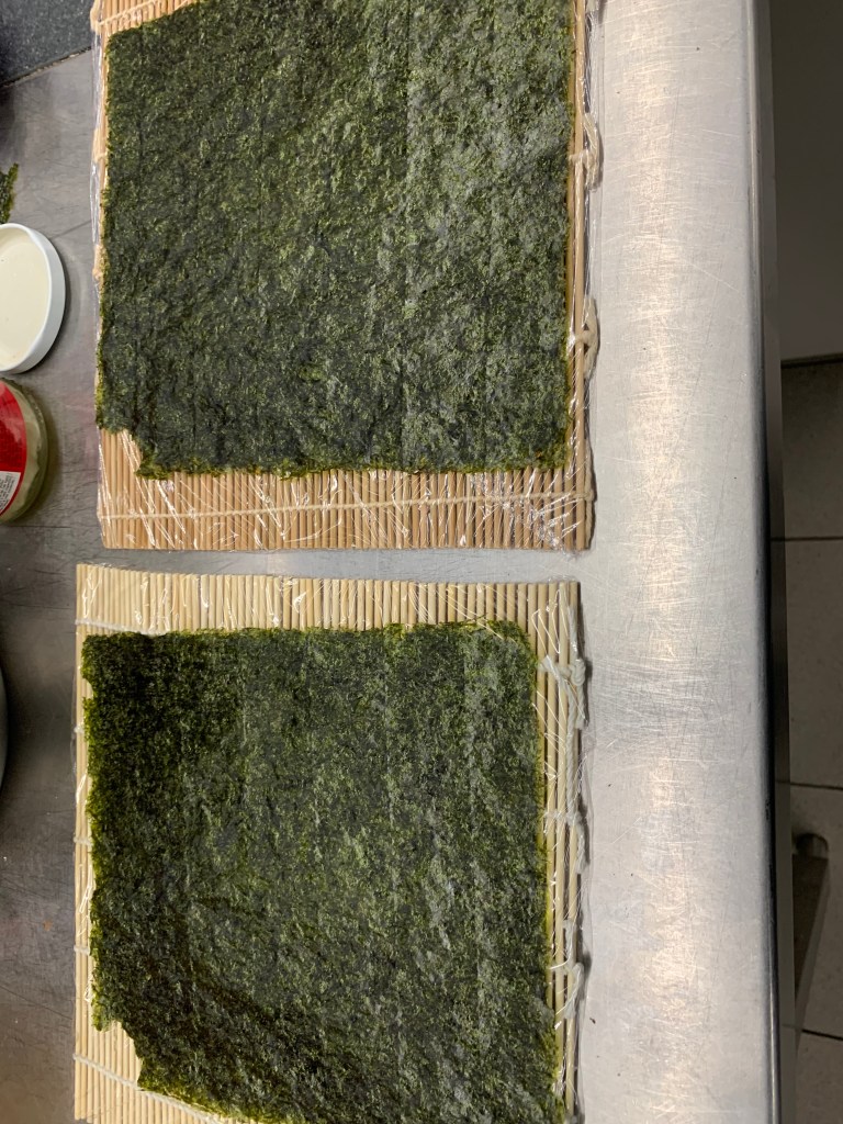 - Een norivel op de bamboe leggen. Hierop de rijst verdelen en wat aandrukken.