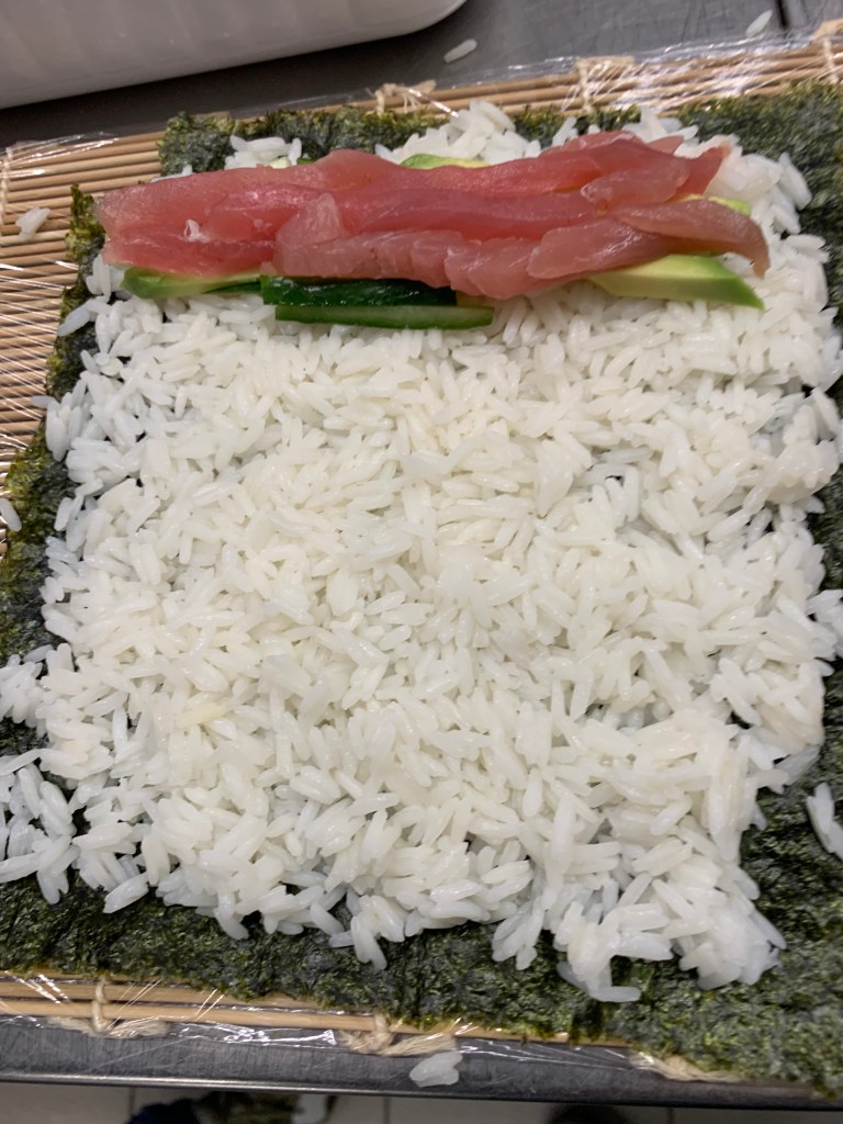 - De tonijn, komkommer en avocado ¾ van de kant op de rijst leggen.