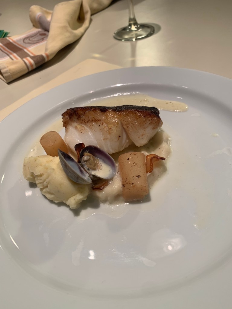 - Schep wat aardappelcrème op het bord.