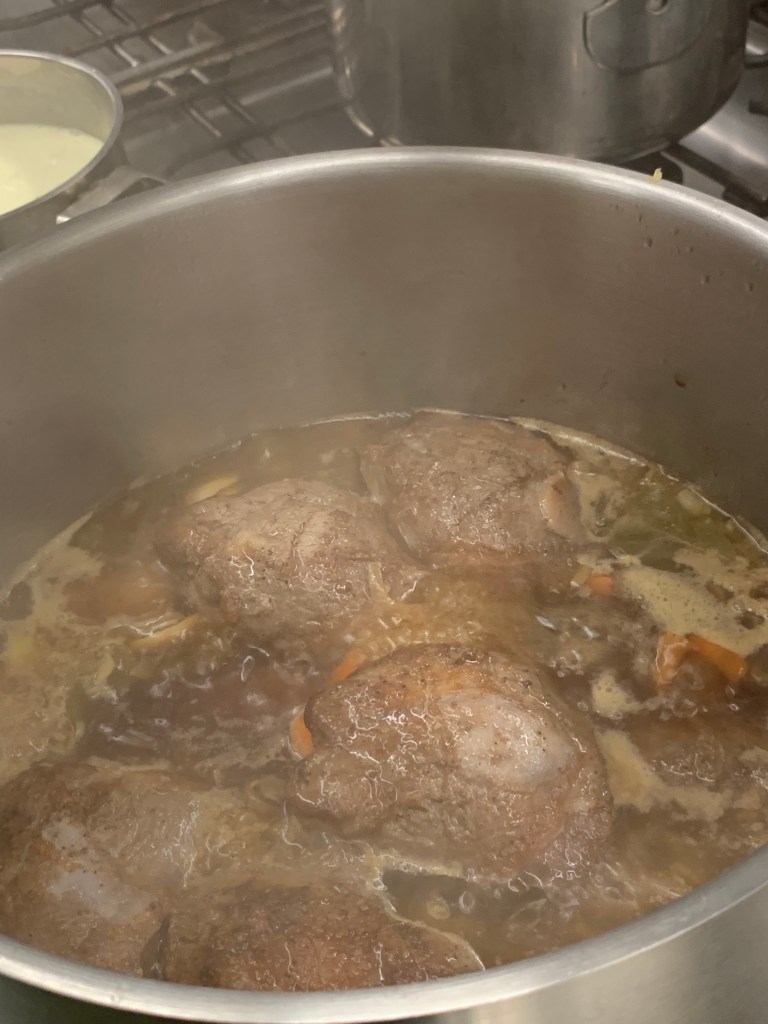 - Leg de kalfswangen terug in de pan.