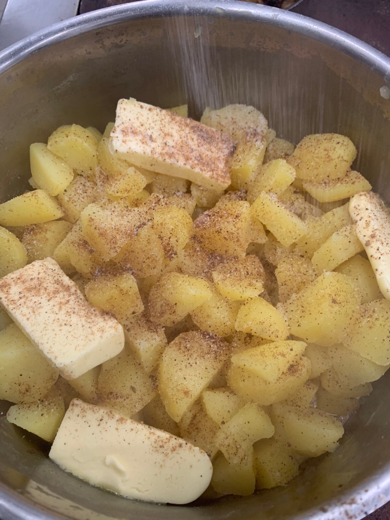- Giet af, voeg boter en room toe en mix of stamp tot een romige crème.