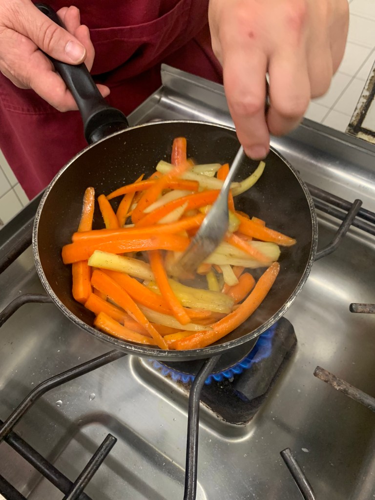 - Stoof de wortelen kort aan in de olijfolie.