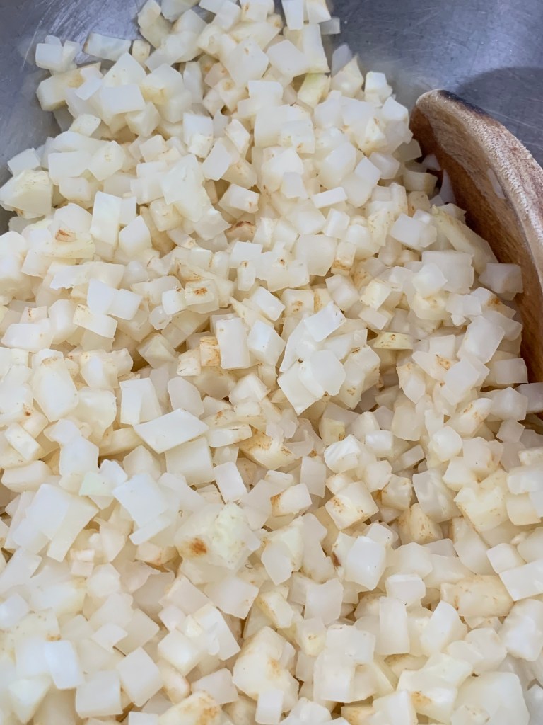 - Snijd de venkel in zo’n klein mogelijke stukjes en bak die aan in boter.