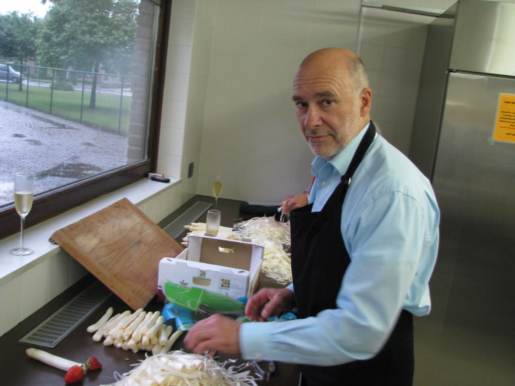 72 witte asperges, 600 g hoeveboter , 3 bussel krulpeterselie , 18 eieren , nootmuskaat