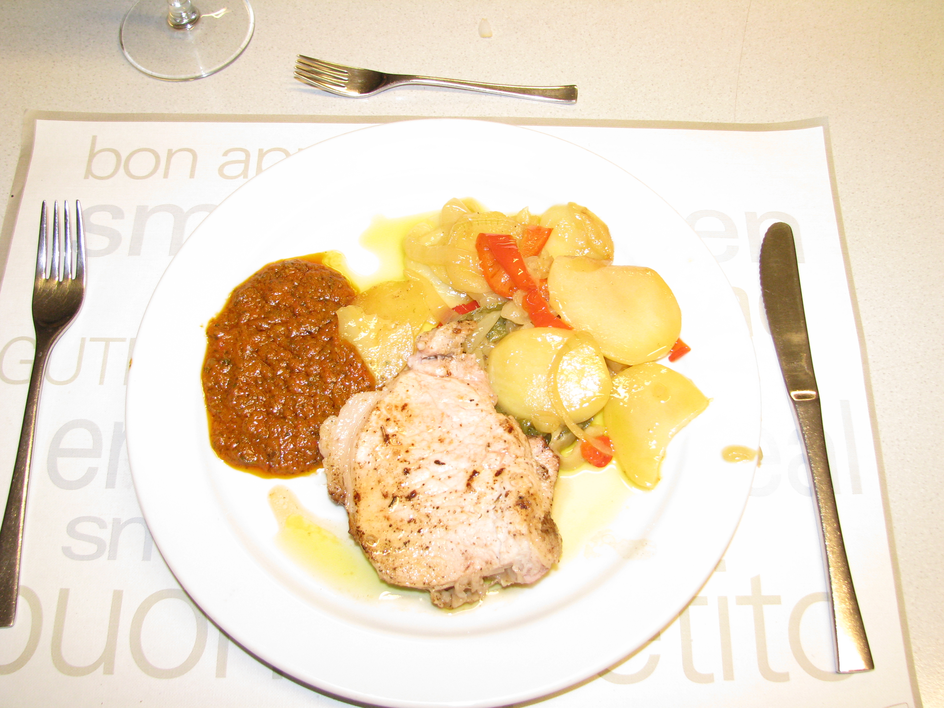 Dresseer op warme borden met de chutney de aardappelen en wat rucola.