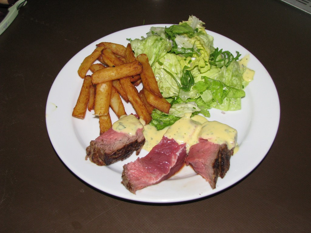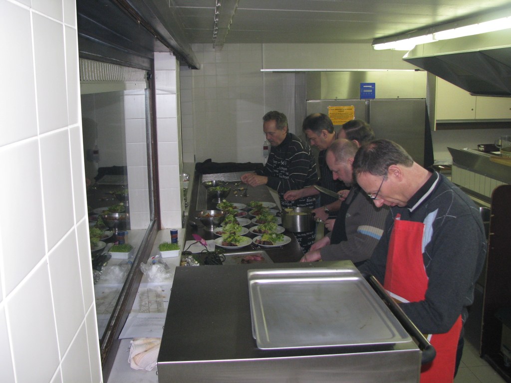 Salade : 3 krop sla, 6 kleine sjalotten, bieslook, 3 scheutje natuurazijn, 3 scheutje olijfolie