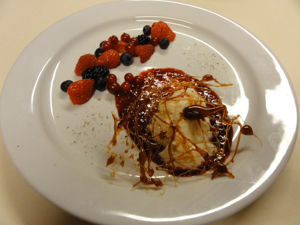 - garneer fruit in lijn op het bord met ertussen gehakt pistachenoten, coulis op het bord met daarop îles flottantes