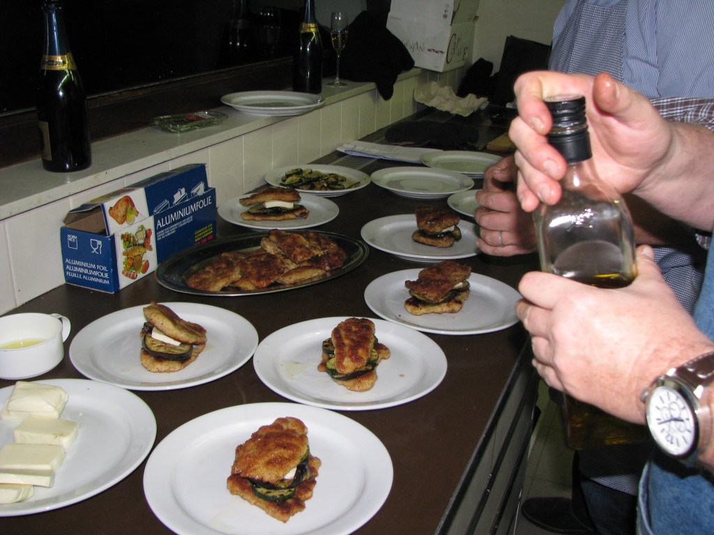 - Schnitzel afhankelijk van de dikte en vleessoort 2 minuten (voor dunne kalfsschnitzels) tot 4 minuten (voor dikkere varkensschnitzel) goudbruin bakken.