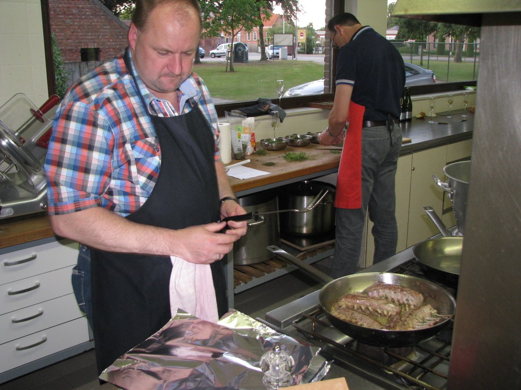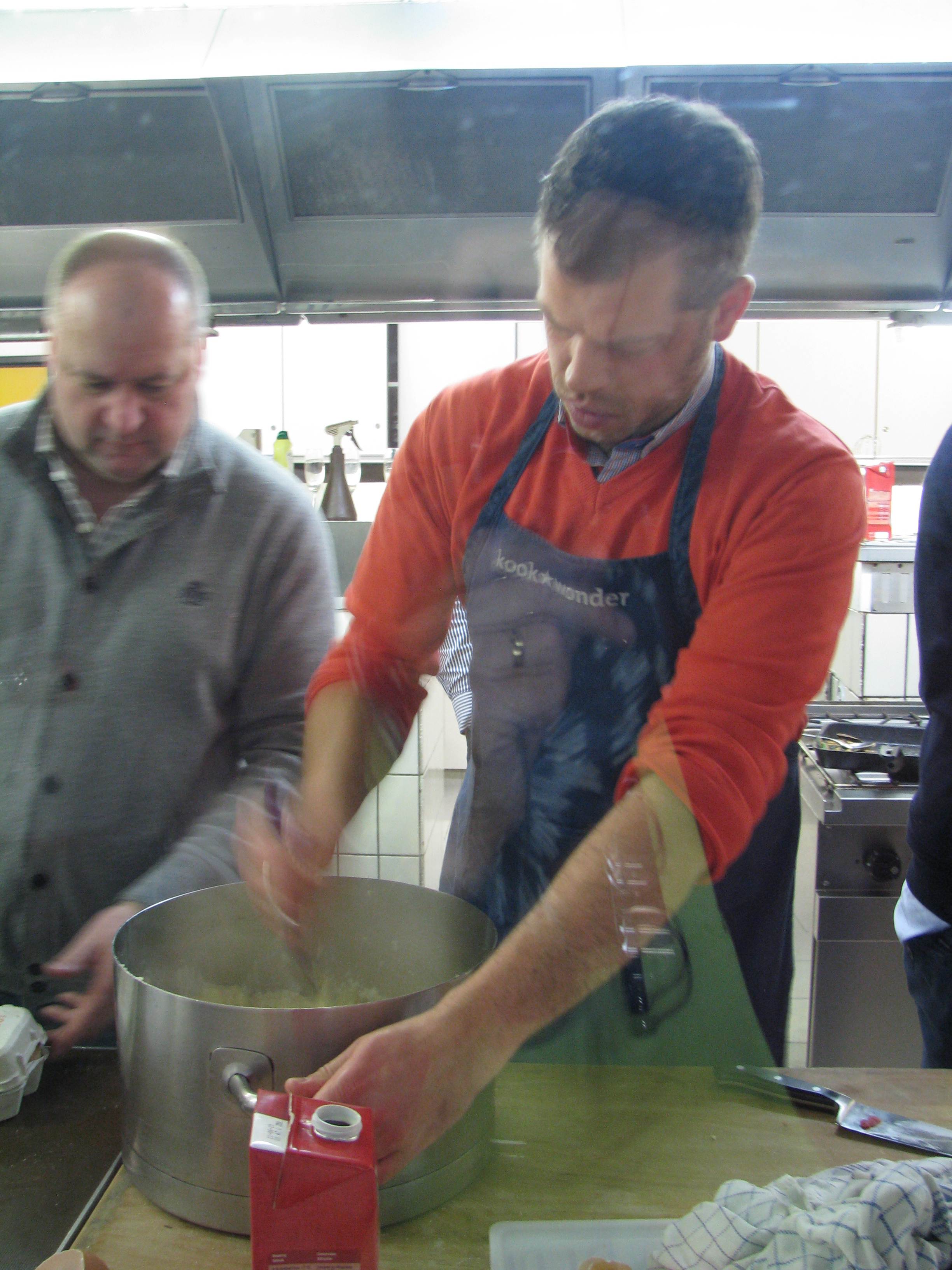 Saus : 6 eierdooiers – 3 el bloem – 3 el mosterd – pezo – 3 fijngehakte ajuinen – peterselie – dragon – gehakte kervel – 7,5 dl room – 1 dl kookvocht asperges (als je asperges geschild hebt, doe je de schil in wat water en laat dit koken)