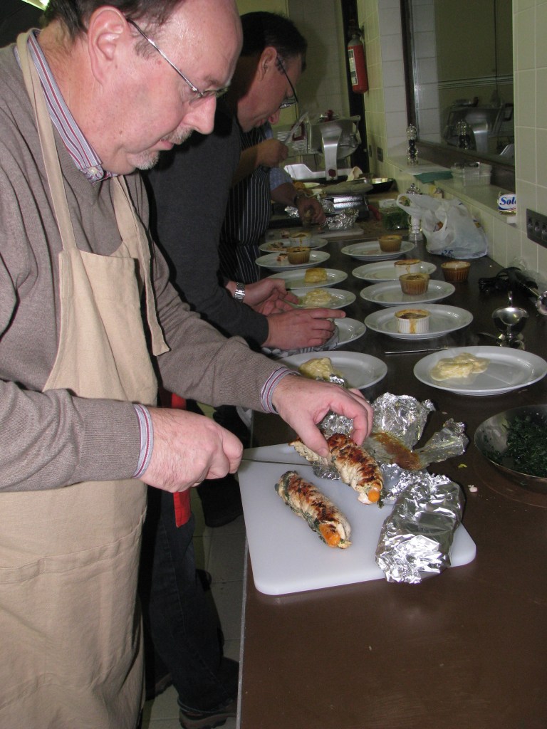 - In midden van bord de gratin, eend en groenten schikken.