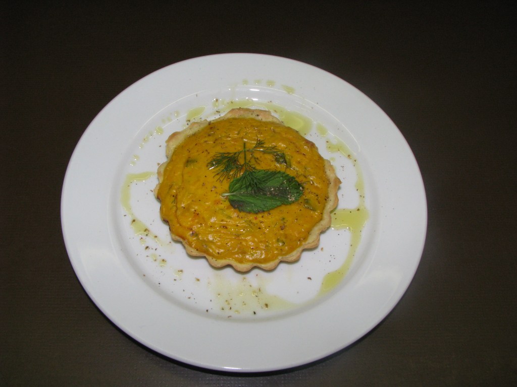 Voor de vulling: 750 gr vrucht van pompoen, 1 ajuin, 2 knoflook, 450 gr geitenkaas, 7 eieren, 1 dl olijfolie, 3 el gehakte muntblaadjes, 3 el gehakte dille.